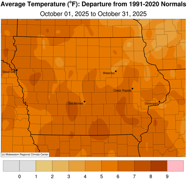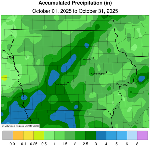 Iowa’s National Weather Service (NWS) stations reported above-average temperatures for the month. October’s statewide average maximum temperature was 67.9 degrees, 5.6 degrees above normal while the average minimum temperature was 45.8 degrees, 6.2 degrees above normal. Muscatine (Muscatine County) reported the month’s high temperature of 93 degrees on the 3ʳᵈ, 23 degrees above normal. Vinton (Benton County) recorded the month’s low temperature of 21 degrees on the 24ᵗʰ, thirteen degrees below normal..