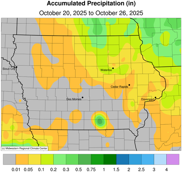 Gusty westerly winds subsided through Sunday (19ᵗʰ) afternoon under sunny skies, with daytime highs in the upper 50s and low 60s. Starry skies were visible into early Monday (20ᵗʰ) morning as winds shifted to a southerly direction and temperatures remained in the 40s statewide. A cold front associated with a low-pressure center moving across northern Minnesota gradually crossed the state, producing light showers. Afternoon temperatures reached the upper 50s behind the front, while cloud cover in eastern Iowa held readings in the upper 60s and low 70s. Skies cleared by midnight as winds returned to a westerly direction, though clouds redeveloped by sunrise on Tuesday (21ˢᵗ). Rain totals from the system were generally light, with the highest amounts in northeastern Iowa; Lansing (Allamakee County) recorded 0.10 inch, while Waterloo (Black Hawk County) observed 0.16 inch. Many stations farther south and west reported less than 0.10 inch. Strong northwesterly winds developed through the day as low stratus clouds blanketed the state, producing chilly temperatures ranging from the upper 40s in the north to the mid-50s in the south. Mason City Municipal Airport (Cerro Gordo County) registered a 53-mph gust, with sustained winds in the 20- to 30-mph range statewide. A few light showers wrapped in behind the low-pressure system, bringing additional totals under 0.10 inch to northeastern stations. Clouds lingered over eastern Iowa into Wednesday (22ⁿᵈ), with the rest of the state under clear skies. Morning lows dropped below freezing on a widespread basis for the first time this season; stations in western and northern Iowa reported temperatures in the mid-20s, with Spencer Municipal Airport (Clay County) recording 25 degrees—ten degrees below normal. Afternoon conditions were calm as high pressure dominated the Upper Midwest, with highs in the low 50s across northern Iowa and up to ten degrees warmer in the south.