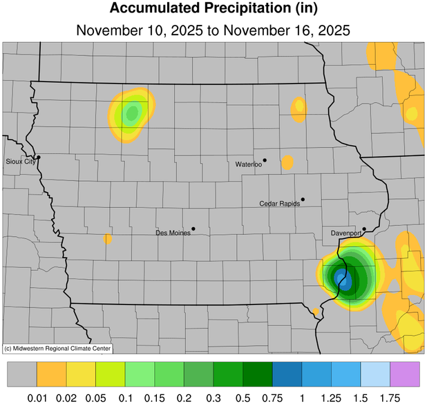 Weekly precipitation totals ranged from no accumulation at most stations to 0.02 inch at Keokuk Municipal Airport (Lee County). The statewide weekly average precipitation was not at a measurable threshold, while the normal is 0.44 inch. Several stations reported the week’s high temperature of 76 degrees on the 14ᵗʰ, on average 27 degrees above normal. Spencer Municipal Airport (Clay County) recorded the week’s low temperature of six degrees on the 10th, 21 degrees below normal.