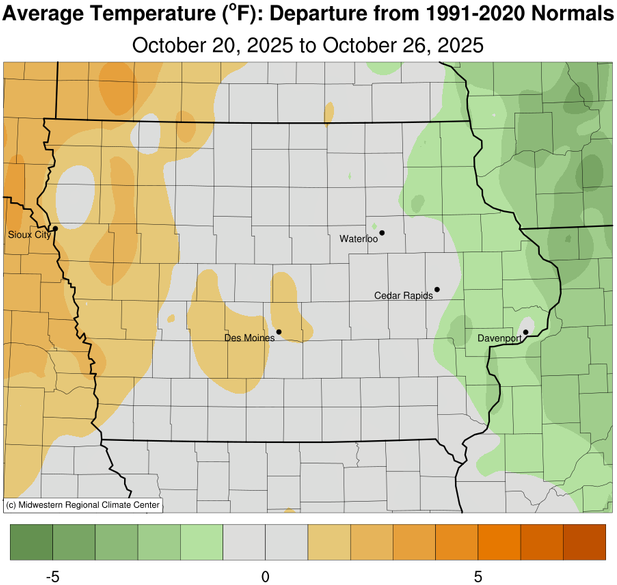 After a six-week stretch of unseasonably warm temperatures, conditions moderated to near normal across much of Iowa during the reporting period. The first widespread frost and freeze event also occurred, with numerous stations reporting the end of the growing season. The statewide average temperature was 50.0 degrees Fahrenheit, which matches the 30-year climatological mean. Most of the state also experienced unseasonably dry conditions, with departures of more than 0.50 inch at many stations.