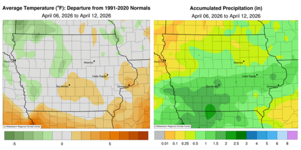 DES MOINES, Iowa (Apr. 13, 2026) - Iowa Secretary of Agriculture Mike Naig commented on the Iowa Crop Progress and Condition Report released by the USDA National Agricultural Statistics Service. The report is released weekly April through November. Additionally, the Iowa Department of Agriculture and Land Stewardship provides a weather summary each week during this time.