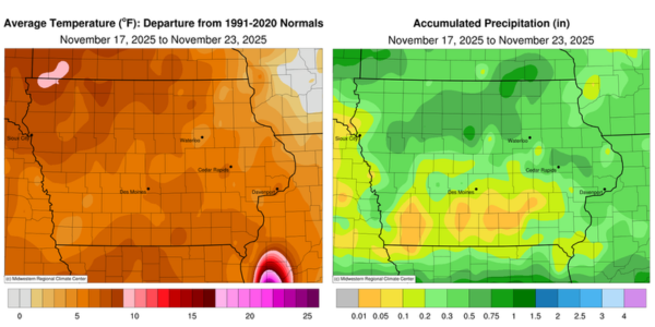 DES MOINES, Iowa (Nov. 24, 2025) – Iowa Secretary of Agriculture Mike Naig commented on the Iowa Crop Progress and Condition Report released by the USDA National Agricultural Statistics Service. The report is released weekly April through November. Additionally, the Iowa Department of Agriculture and Land Stewardship provides a weather summary each week during this time.