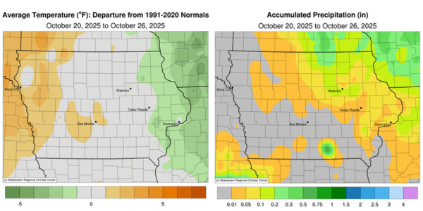 DES MOINES, Iowa (Oct. 27, 2025) – Iowa Secretary of Agriculture Mike Naig commented on the Iowa Department of Agriculture and Land Stewardship’s weekly weather summary released today. Information from the Iowa Crop Progress and Condition Report, which is released weekly by the United States Department of Agriculture National Agricultural Statistics Service from April through November, was not available due to the federal government shutdown.