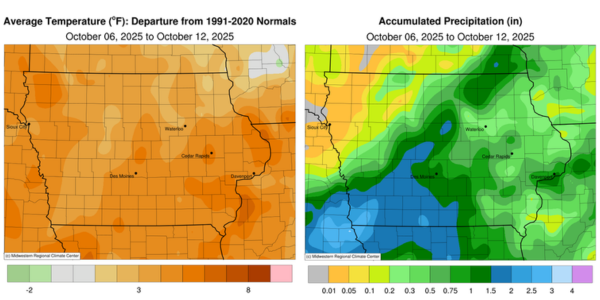 DES MOINES, Iowa (Oct. 13, 2025) — Iowa Secretary of Agriculture Mike Naig commented on the Iowa Department of Agriculture and Land Stewardship’s weekly weather summary released today. Information from the Iowa Crop Progress and Condition Report, which is released weekly by the United States Department of Agriculture National Agricultural Statistics Service from April through November, was not available due to the federal government shutdown.