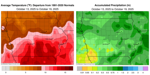 DES MOINES, Iowa (Oct. 20, 2025) — Iowa Secretary of Agriculture Mike Naig commented on the Iowa Department of Agriculture and Land Stewardship’s weekly weather summary released today. Information from the Iowa Crop Progress and Condition Report, which is released weekly by the United States Department of Agriculture National Agricultural Statistics Service from April through November, was not available due to the federal government shutdown.